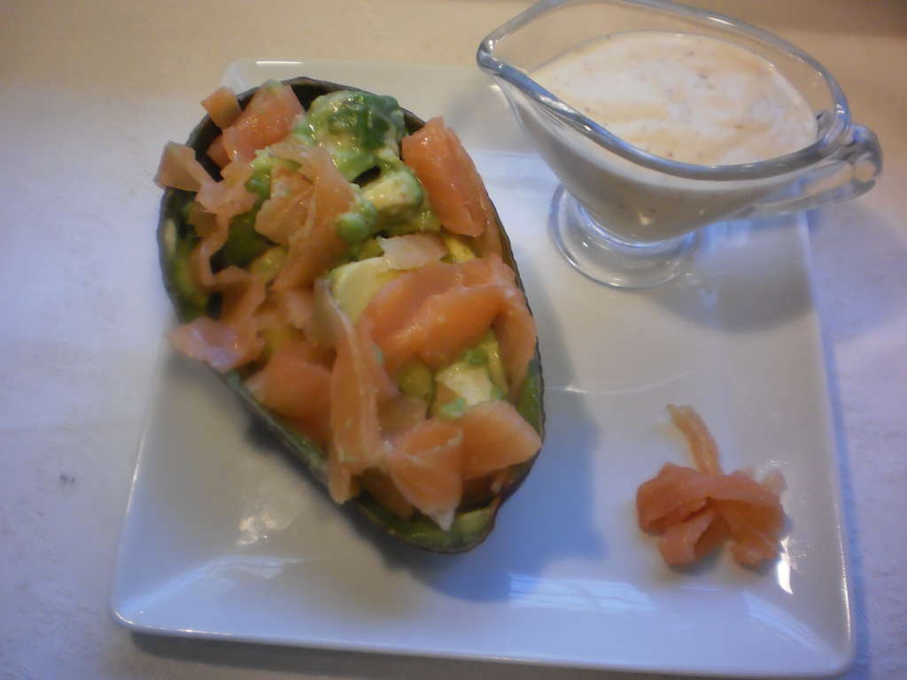 Abrir los aguacates por la mitad,quitar el hueso y sacar la carne,partirla en láminas,mezclar con el salmón y la salsa.