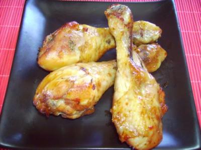 Pasa los trozos de pollo a una fuente y riegalo con el zumo de la marinada,tapa con papel de aluminio y hornear a 190º durante 40 minutos,retira el papel y deja unos minutos mas hasta que dore y esten listos para desgustar.